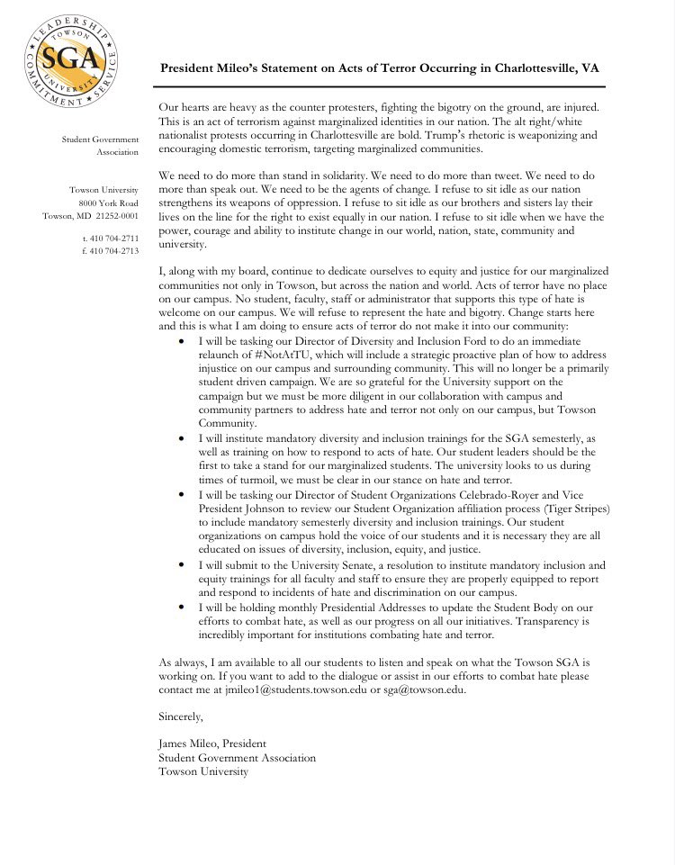 We stand with statements made by University community members, including those made by TU President Kim Schatzel and SGA President James Mileo, that condemn the events in Charlottesville and pledge support to the University community.