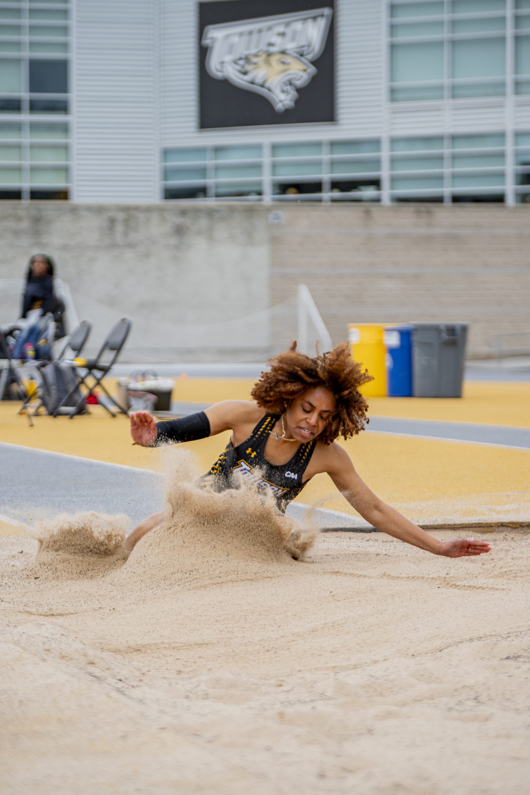 Towson’s Chayce Bryson is landing in the sand and completing her triple jump. The first day of the Towson Invitational was held at Towson’s Johnny Unitas Stadium and the athletic fields in Towson, MD, on March 28th, 2025. Kenny Storck Jr/The Towerlight.