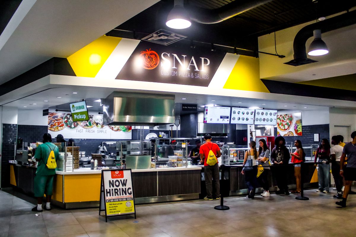 The signs appeared at SNAP Pizza, Halal Shack and Burgers + Fries in Newell Hall. The messaging framed the change as an environmental initiative intended to reduce single-use waste. The cost also applied to any Grubhub orders.